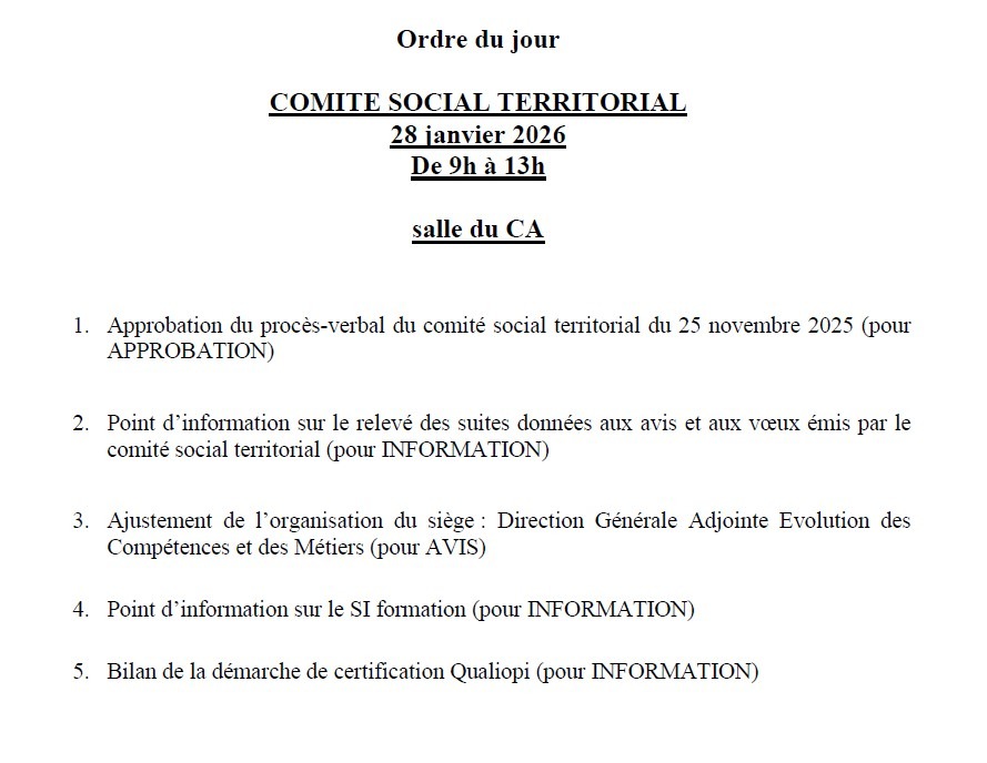 CST CNFPT – Séance du 28/01/26 – Ordre du jourPar UNSA_CNFPT / 14 janvier 2026 Publications similaires : CST du 18/03/25- Déclaration préalable UNSA CNFPT CST du 30 septembre 2025 – Déclaration préalable de l’UNSA CNFPT Glossaire CST CNFPT – Séance du 25/11/25 – Ordre du jour