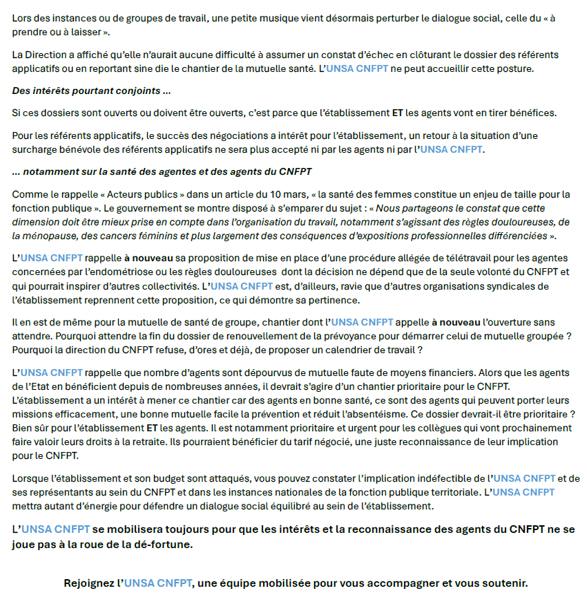 Dialogue social, « à prendre ou à laisser » ou la roue de la « dé-fortune » ? (F3SCT du 17 mars 2026 – Déclaration préalable de l’UNSA CNFPT)Par UNSA_CNFPT / 18 mars 2026 Publications similaires : F3SCT du 13 mai 2025 – Déclaration préalable de l’UNSA CNFPT CST du 30 septembre 2025 – Déclaration préalable de l’UNSA CNFPT F3SCT du 16 décembre 2025 – Déclaration préalable de l’UNSA CNFPT UNSA CNFPT – Interventions sur les dossiers de la F3SCT du 16/12/25 (CFPM Angers, QVCT, …)
